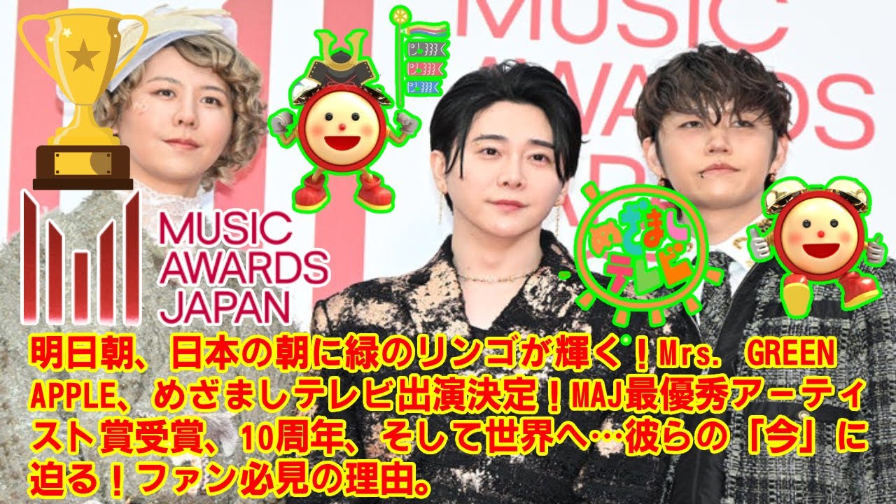 【Mrs. GREEN APPLE】明日朝、日本の朝に緑のリンゴが輝く!Mrs. GREEN APPLE、めざましテレビ出演決定!MAJ最優秀アーティスト賞受賞、10周年、そして世界へ…彼らの「今」